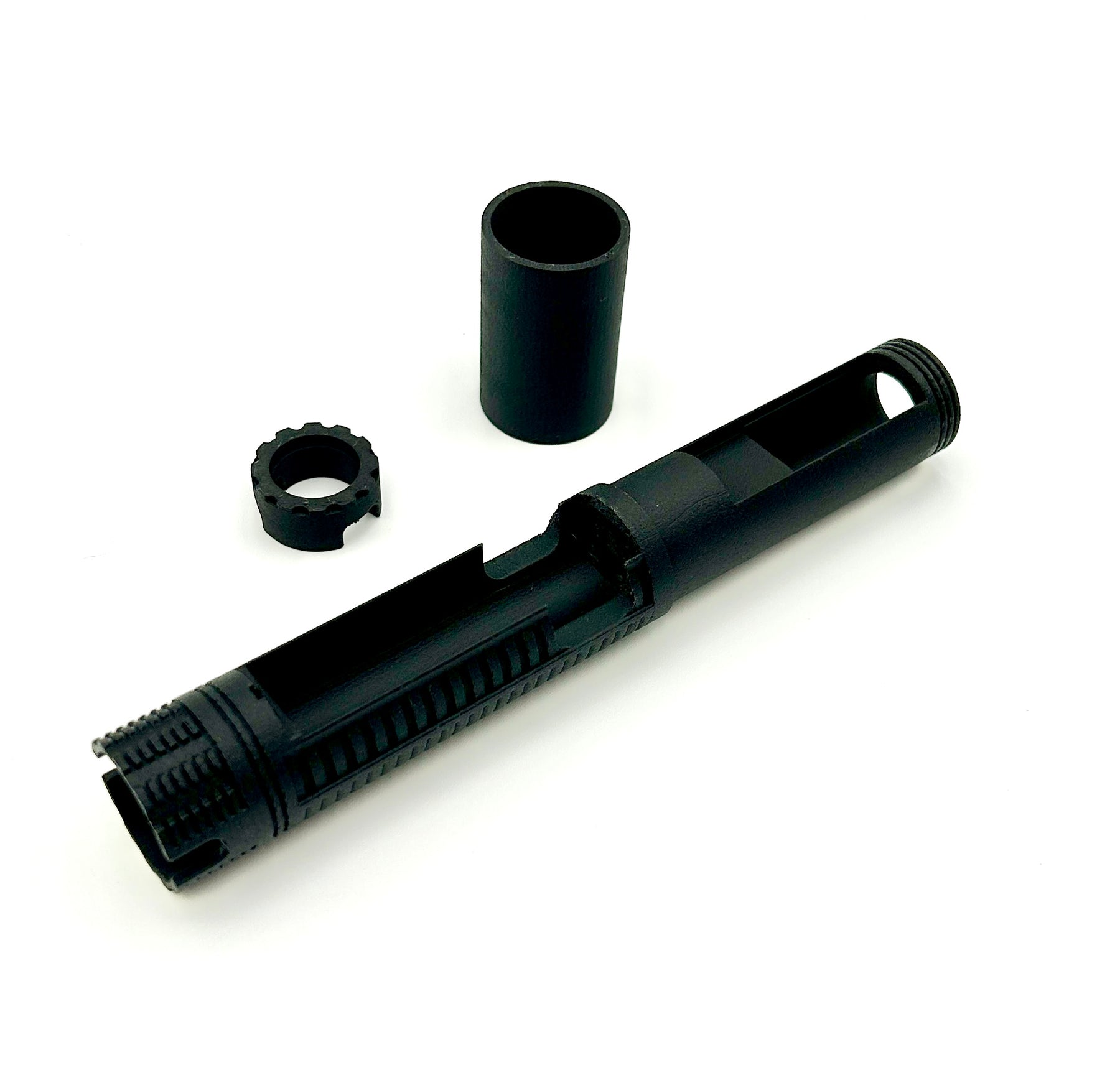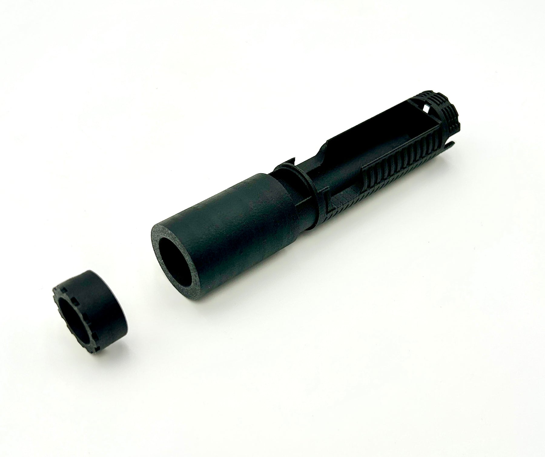 Printed in three parts, the small emitter piece holds the hiltside connector, the middle piece holds the pin side of the 6 trace rotary chassis PCB to be fixed in the upper part of the hilt.