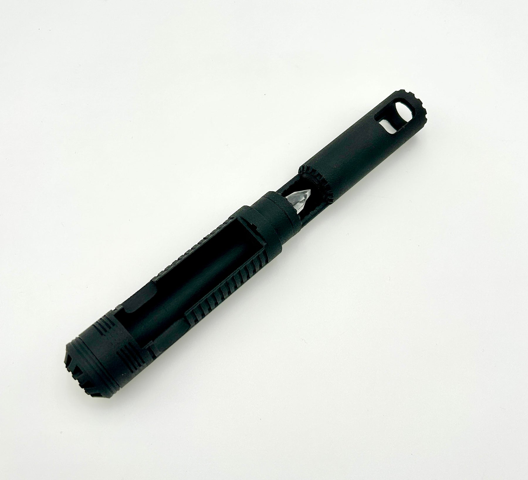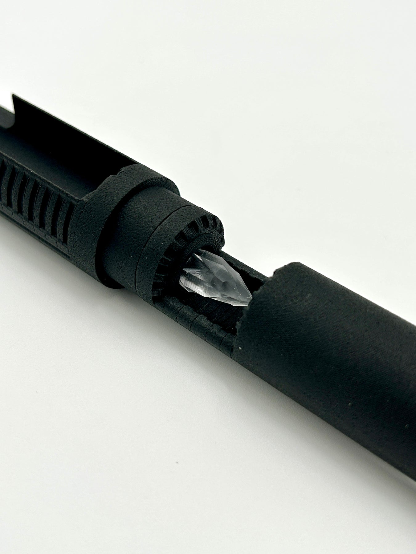 The upper chassis section holds both the hiltside pixel connector as well as the crystal for the chamber area, please designate if you wish to include the resin printed crystal in your purchase. The backside of the upper chassis has a channel for routing your switch and bunny ear pixel accent wires down to the soundboard. With proper alignment you can view the crystal chamber beneath the removable brass part of the hilt.