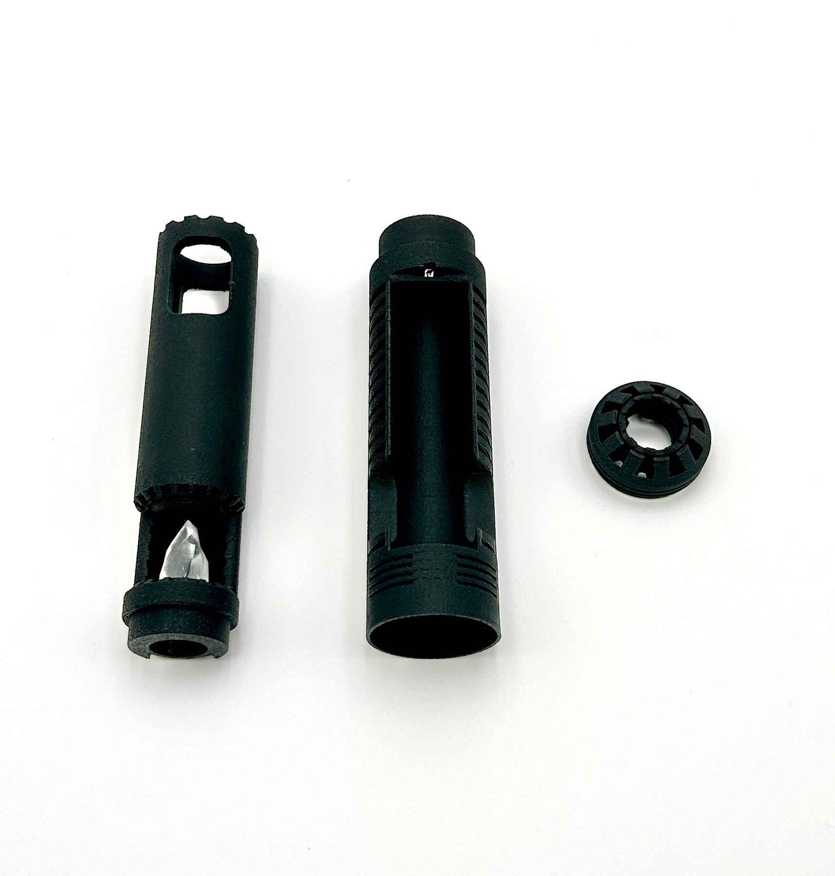 This chassis is printed in three separate parts, they will need to be glued together at the separation points as you install you chassis. The smaller piece is an optional attachment that can be affixed to the speaker end of the chassis for those wishing to add some accent lighting to their pommel area.